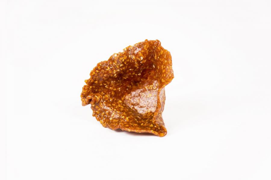 La Bugia rappresenta uno dei prodotti esteticamente più belli da osservare oltre che da gustare, la sinuosità della sua forma gode di una femminilità ed eleganza inimitabili. Il design è differente per ogni pezzo prodotto, ogni Bugia è diversa dall'altra, solo grazie a queste caratteristiche notiamo come traspare l'artigianalità del prodotto che lavora singolarmente ogni singolo pezzo con le proprie mani, non ci stancheremo mai di sottolinearlo. Il nome del prodotto nasce in maniera scherzosa durante un dibattito per capire a quale forma geometrica si avvicinasse maggiormente, chi pensava ad un triangolo, chi a un fiore e così via, ma ogni forma sembrava non appartenere a questa creazione, sembrava proprio una bugia ed è in quel momento che Giacomo decise di chiamarla così. La decorazione è semplice, per non appesantire un dessert già completo, qualche pallina di gelato con un po’ di frutta renderà il dessert strabiliante, perchè la sua forma esalta l'importanza del croccante stesso; se invece volete valorizzare ancor più la forma irregolare e perfetta al tempo stesso, osate con decorazioni estrose che renderanno il vostro dessert un capolavoro. La Bugia viene richiesta anche con il croccante a base di mandorla perchè il suo sapore risulterà ancora più dolce rispetto al croccante di arachidi, mentre per quanto riguarda il sesamo il sapore è più amarognolo anche se maggiormente delicato. La Bugia è un prodotto della Linea Monoporzione, quindi è ideale se volete concludere in bellezza una cena che sia a casa in compagnia di amici oppure nel vostro ristorante preferito; è un dessert unico nel suo genere e non ho dubbi che rimarrete ad osservarla per la sua bellezza oltre che assaporarla fino all'ultima briciola croccante.